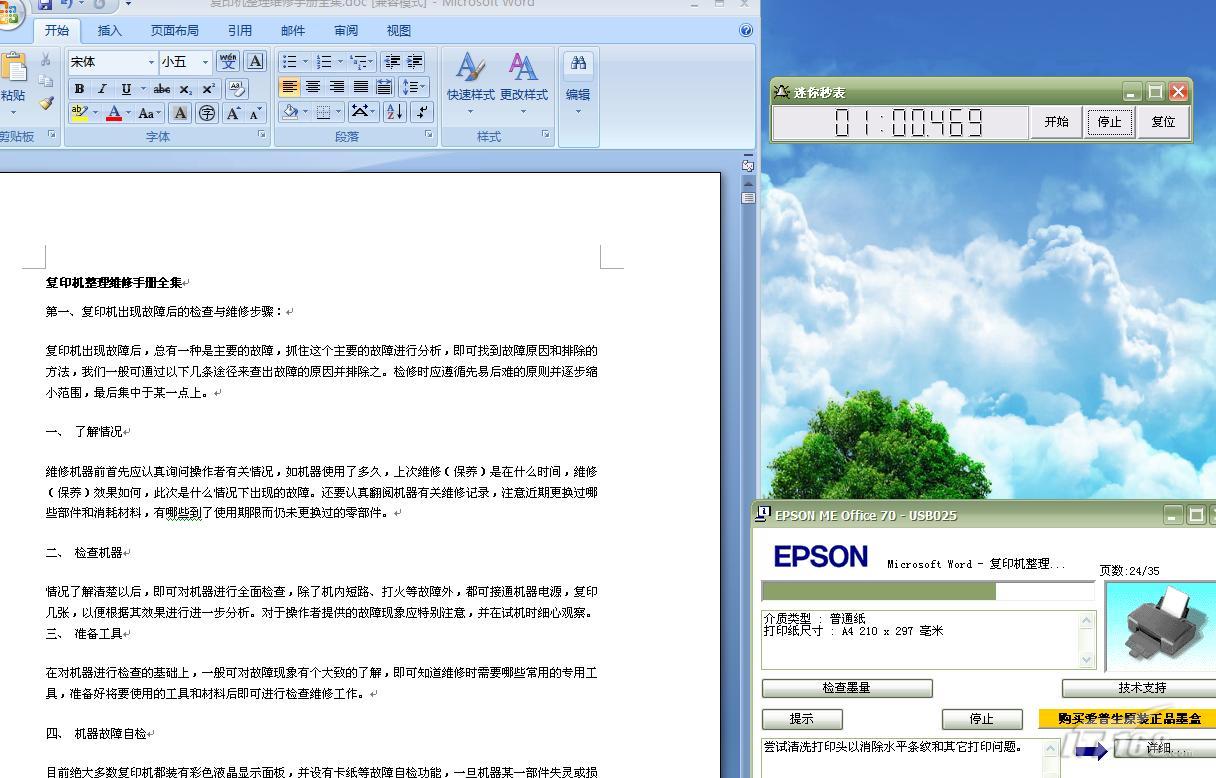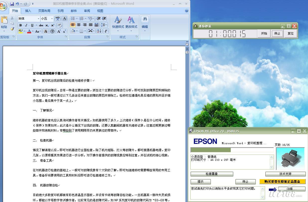 在进行文本模式下打印黑白文本,我们使用一个电子秒表进行测试,进行一分钟的黑白文本打印时候,总共是耗时一分钟,实际打印张数为15张,第16张在机器里面还没有出来,我们按15张计算。经济模式下打印张数为22页每分钟,第23张正在打印没有出来。