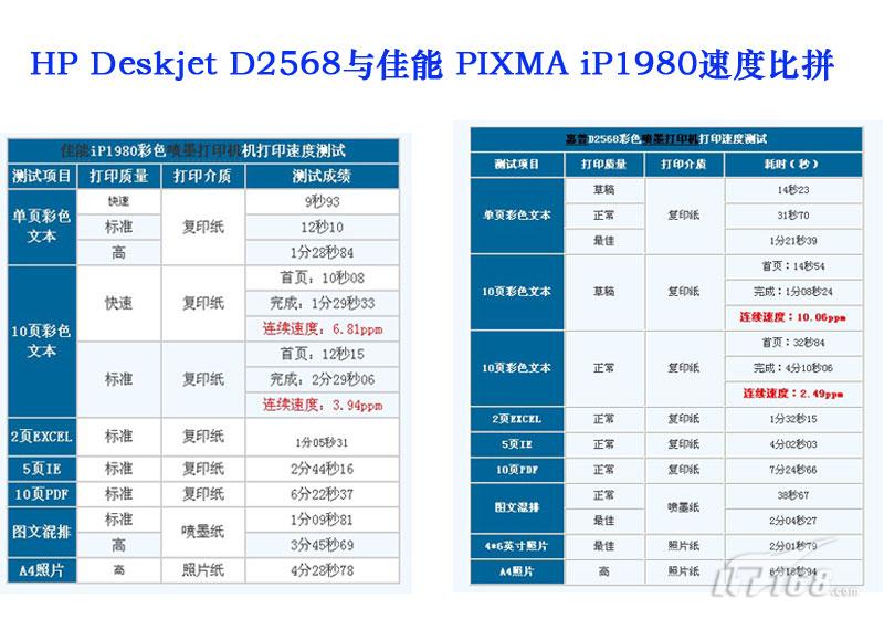 编辑点评:从速度比拼中可以看到一个明显的差异,这个差异就是机器的特性,佳能ip1980的特性是,适合家庭用户及soho办公用户中,使用量不太大,对图文打印需求大对质量要求较高的用户使用。而HP D2568适合对文本需求量稍微多,可以快速输出图文要求不高的文档。